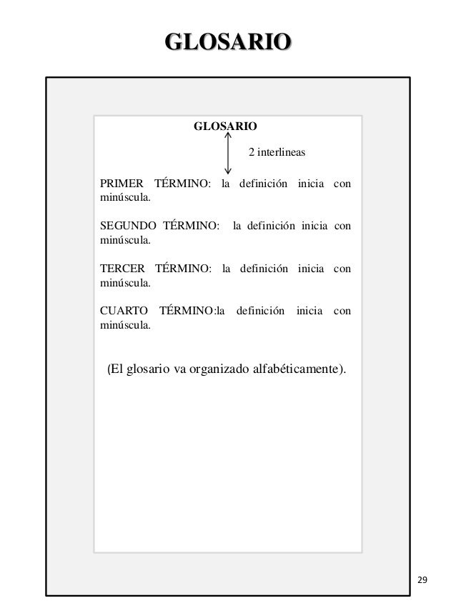 - Luego de dos interlineados posteriores al título, iniciamos la lista con la primera palabra que vamos a definir. Ésta irá en mayúscula seguida de dos puntos y seguido. Al definirla iniciaremos el texto con minúscula.